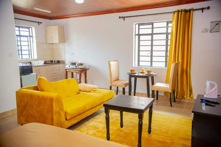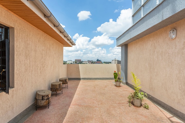 This penthouse studio is at the rooftop  away from the other 16 apartments in the building. It’s on the 5th floor with no elevator, guests will climb stairs. It shares the rooftop with one other studio where I host guests. It offers the view of the Nairobi central business area which is about 10minutes walk.
